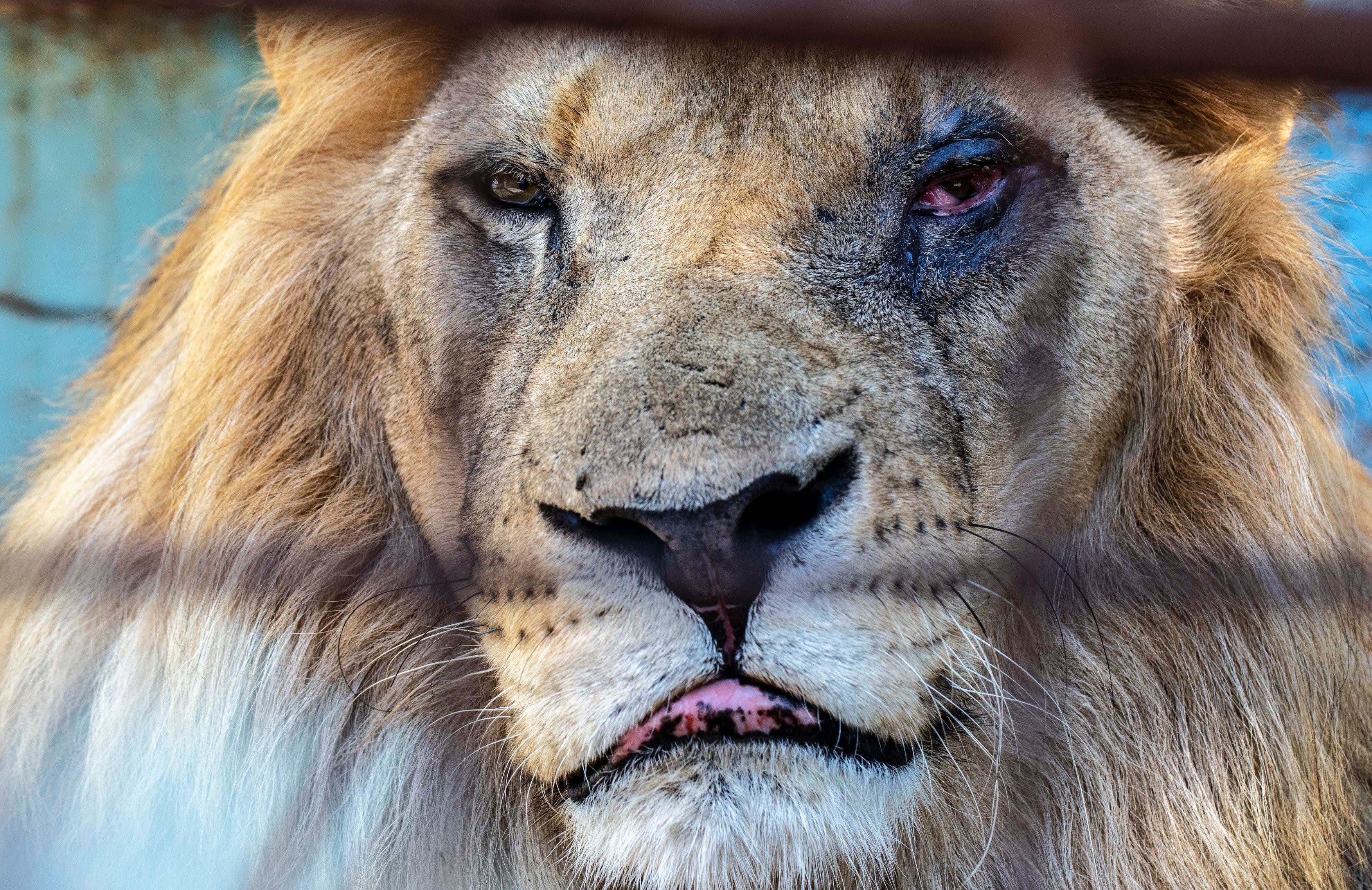 Лъв със заболяване на окото, а вероятно и още някои здравословни проблеми. Той е и недохранен, а на снимките може да се види в какво състояние е неговата клетка.